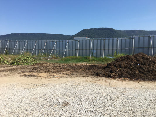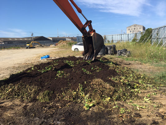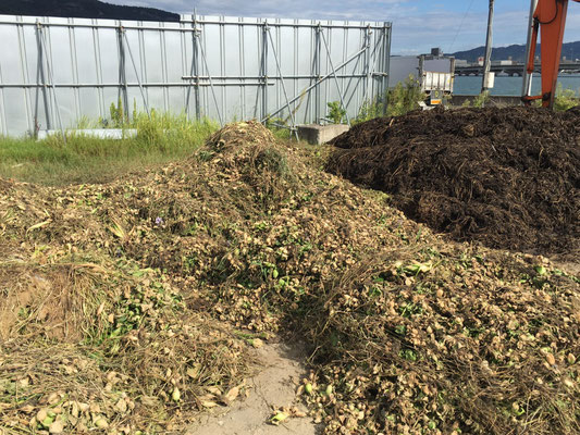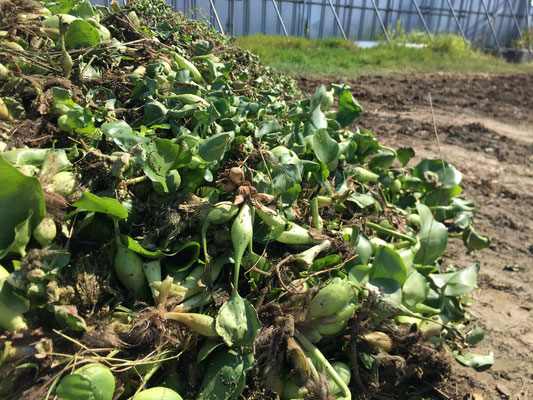 以下は、仕込み作業の状況写真です。 水草は一定量集まったら、新鮮なうちに、どんどん発酵促進材Kyowa(種菌)と混合し、仕込んでいきます。まもなく温度が上がり始め、 一週間もたつと、発酵が進み、ホテイアオイの姿形がわからないくらいに変化します。温度も56℃まで上がってきました。悪臭はありません。 さらに発酵が進むと、60℃を超えてきます。最後はサラサラの黒い堆肥が出来上がります。 出来上がりが楽しみです!