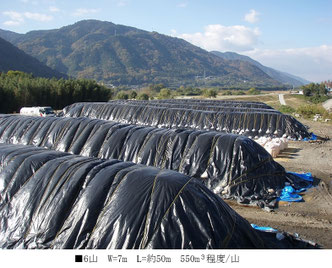 W=7m、L=約50m、H=3.5m、 一山550~600m3×7山、積み込みました。 ブラックシートをかけ、シートが風に飛ばされないように固定し、約半年間、熟成します。 風の強い場所でしたが、台風が来てもシートは飛ばされませんでした。
