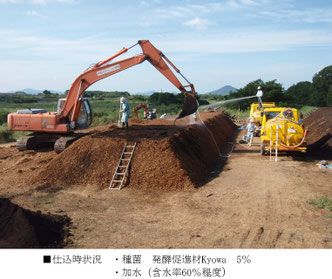 仕込み状況です。散水による水分調整、発酵促進のための種菌混合、積み込み作業を行います。